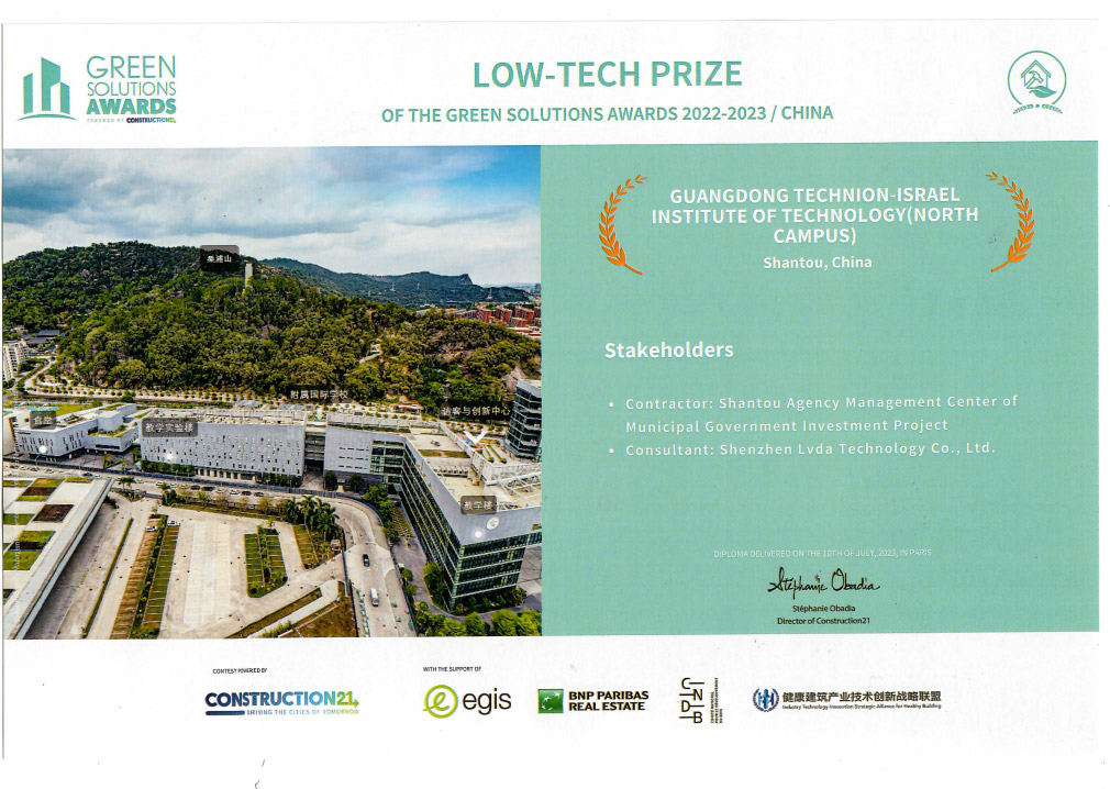 8月25日,2023年(第五届)健康建筑大会在北京隆重召开。大会对全国荣获第九届C21国际“绿色解决方案”中国区大奖的14个项目进行了表彰。其中,由深圳市绿大科技有限公司助力打造的项目——广东以色列理工学院北校区,荣获“生态建筑解决方案奖”,并以生态建筑类中国区大奖第一名入围C21国际大奖评审。