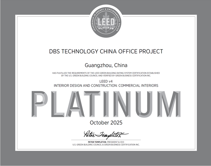 近日,绿大科技完成的项目星展科技产业(中国)有限公司【以下简称“星展科技(中国)”】广州办公室项目荣获能源与环境设计先锋(Leadership in Energy and Environment Design,简称LEED)铂金级认证。该认证是绿色建筑领域的国际权威荣誉,铂金级为其最高等级。